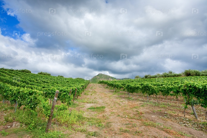 Виноградник под серыми облаками на Сицилии
