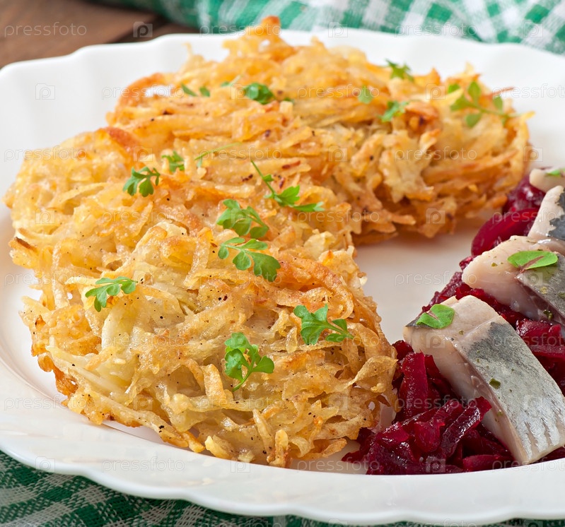 Ароматные картофельные оладьи и сельдь со свеклой