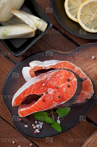 Свежие стейки форели на деревянной разделочной доске с приправами