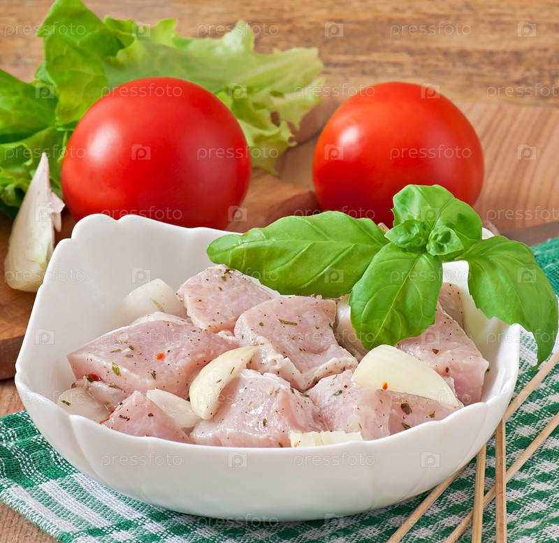 Маринованные куски мяса для шашлыка с луком и зеленью