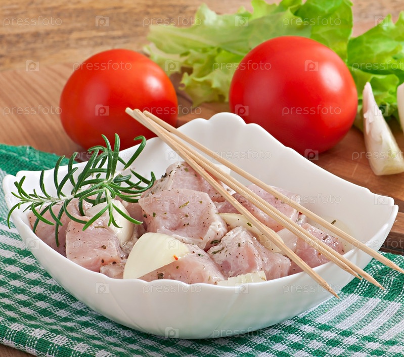 Маринованные куски мяса для шашлыка с луком и зеленью