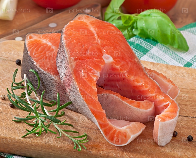 Свежие сырые стейки форели на деревянной разделочной доске