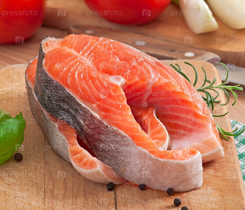 Сырые стейки форели со специями на деревянной разделочной доске