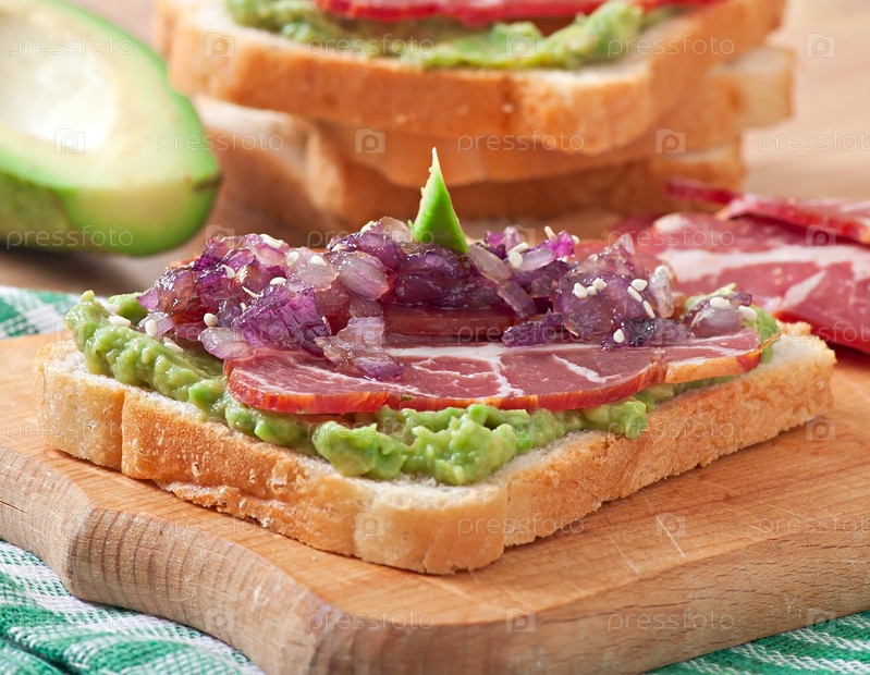 Сэндвич с ветчиной, соусом из авокадо и карамелизированным луком