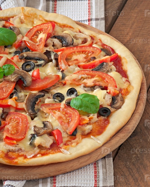Пицца с курицей, помидорами, перцем и грибами