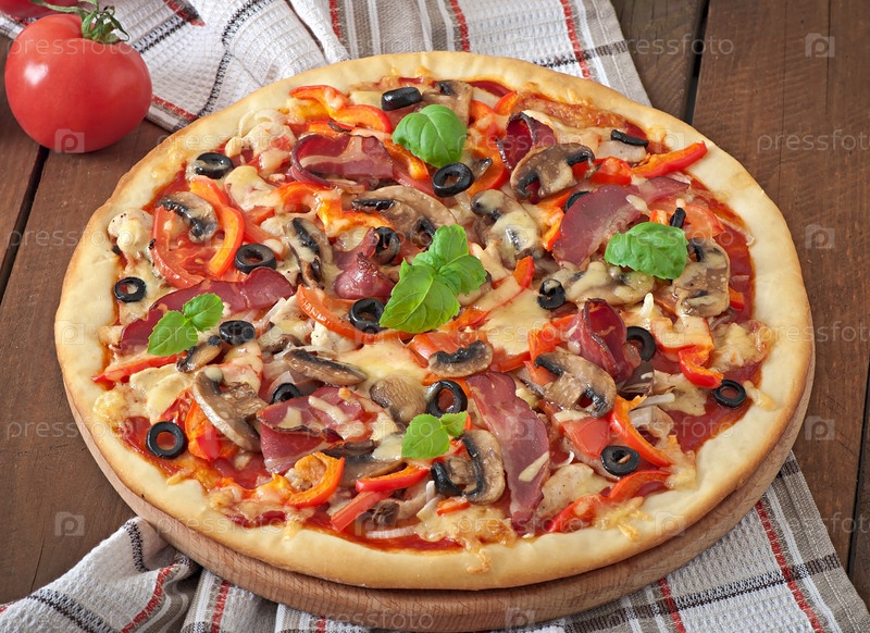Пицца с ветчиной, грибами и оливками