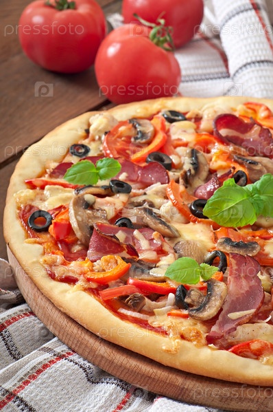 Пицца с ветчиной, грибами и оливками