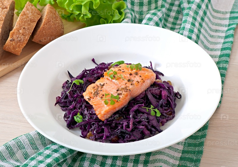 Жареный лосось с красной капустой