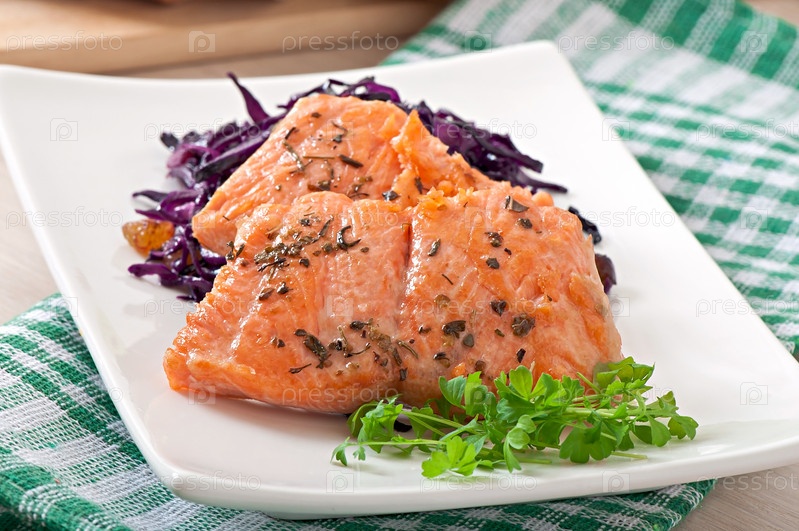 Жареный лосось с красной капустой