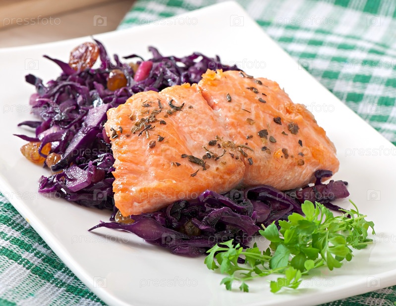 Жареный лосось с красной капустой