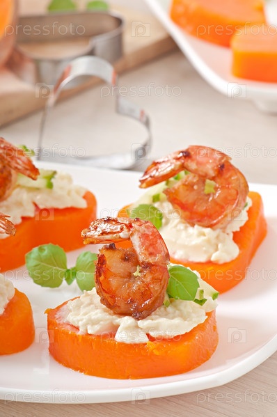 Закуска из креветок и плавленого сыра на сердцах из тыквы