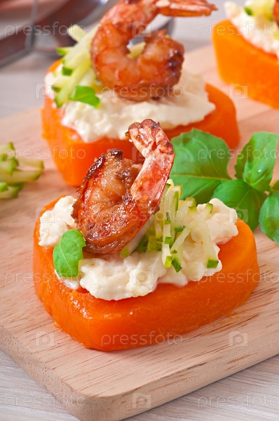 Закуска из креветок и плавленого сыра на сердцах из тыквы