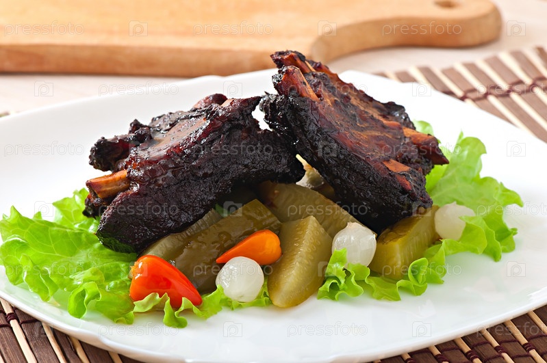 Запеченные говяжьи ребрышки в маринаде с овощами