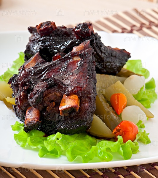 Запеченные говяжьи ребрышки в маринаде с овощами