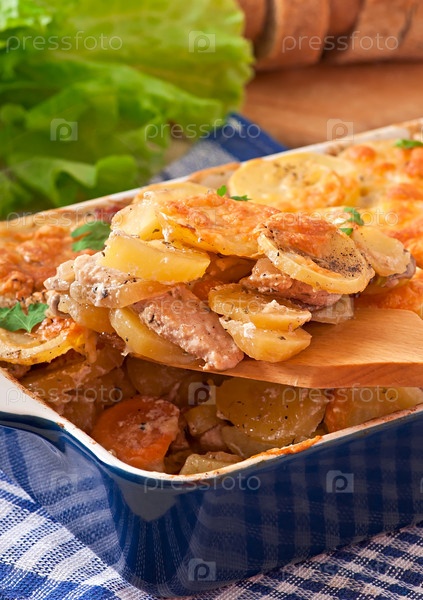 Картофельная запеканка с мясом, грибами и сыром