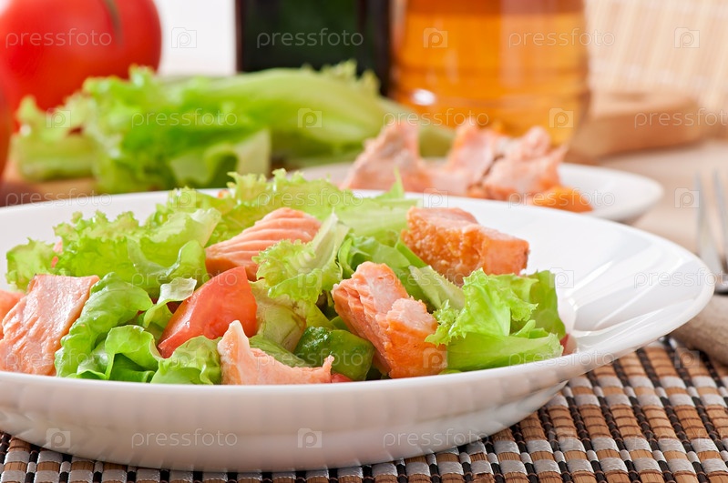 Салат из свежих овощей с кусочками лосося