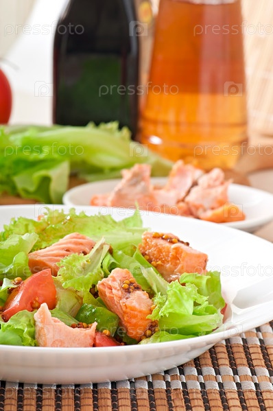 Салат из свежих овощей с кусочками лосося