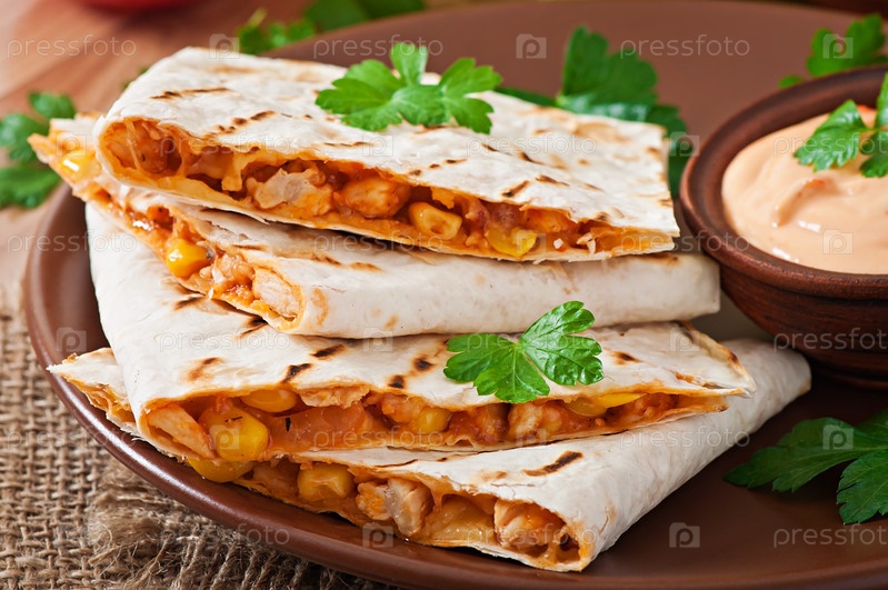 Мексиканская кесадилья, нарезанные овощи и соусы на столе