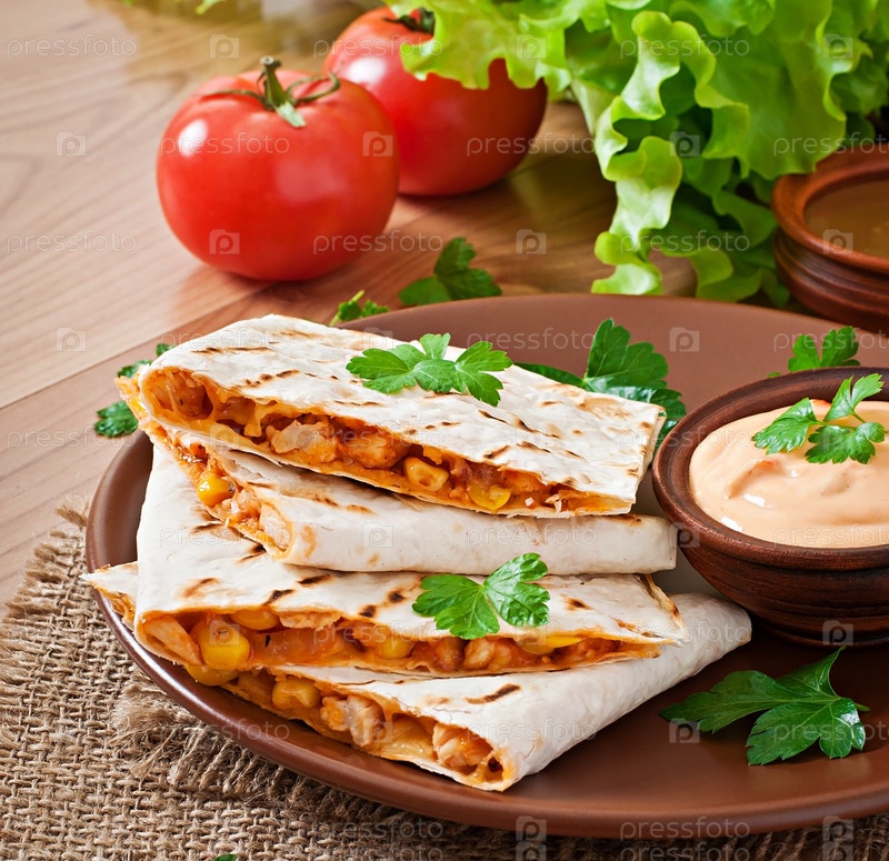 Мексиканская кесадилья, нарезанные овощи и соусы на столе
