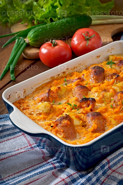 Запеканка с колбасой, беконом и яблоками