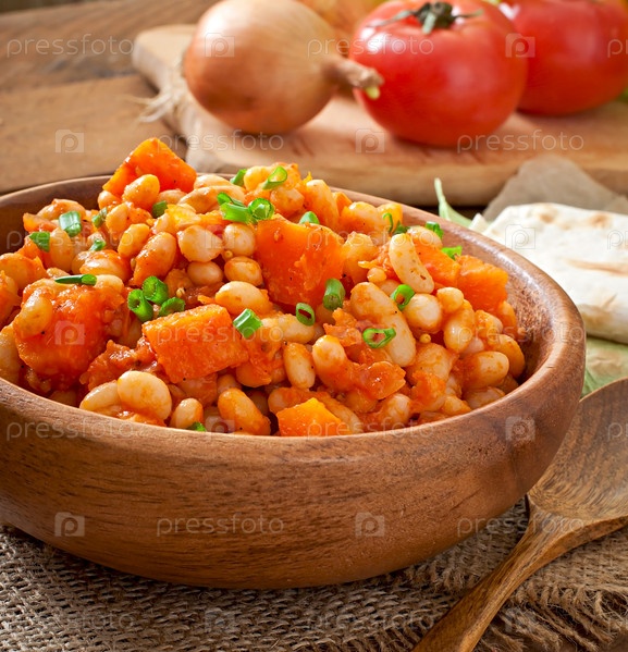 Тушеная белая фасоль с ломтиками тыквы в томатном соусе