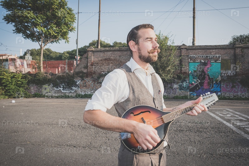Красивый бородатый хипстер играет на мандолине