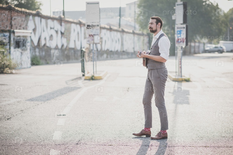 Красивый бородатый хипстер играет на мандолине