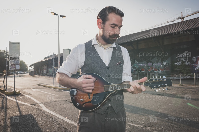 Красивый бородатый хипстер играет на мандолине