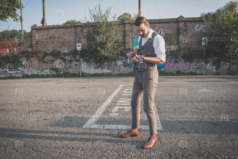 Красивый бородатый хипстер играет на мандолине
