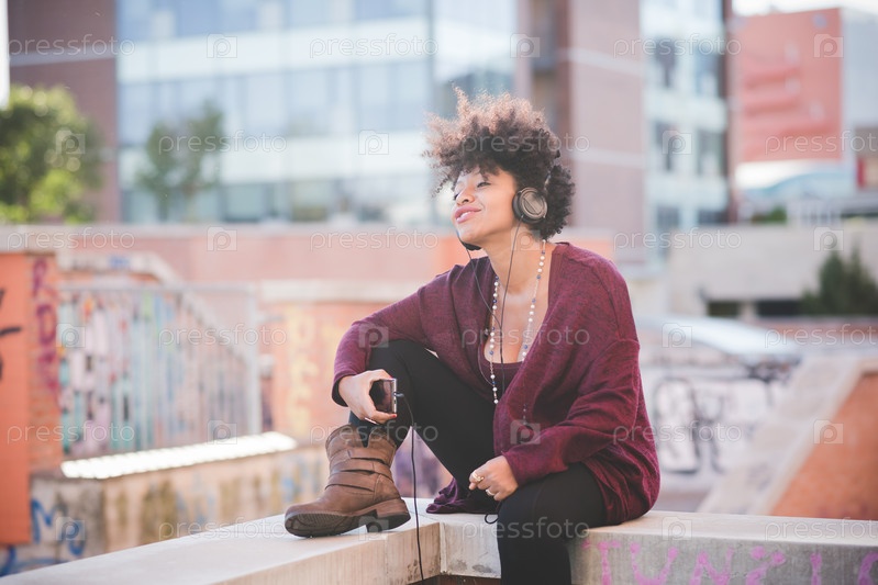 Темнокожая женщина слушает музыку в наушниках