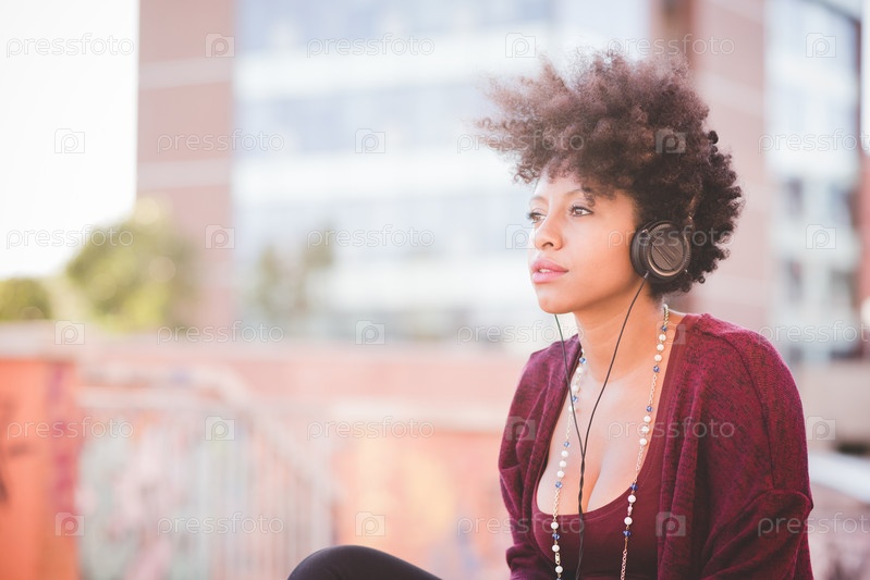 Темнокожая женщина слушает музыку в наушниках