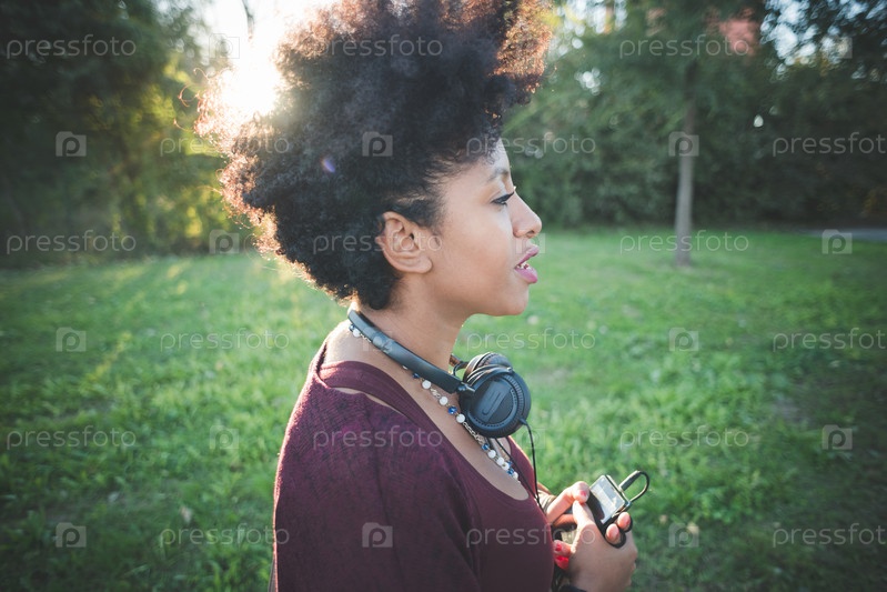 Темнокожая женщина слушает музыку в наушниках