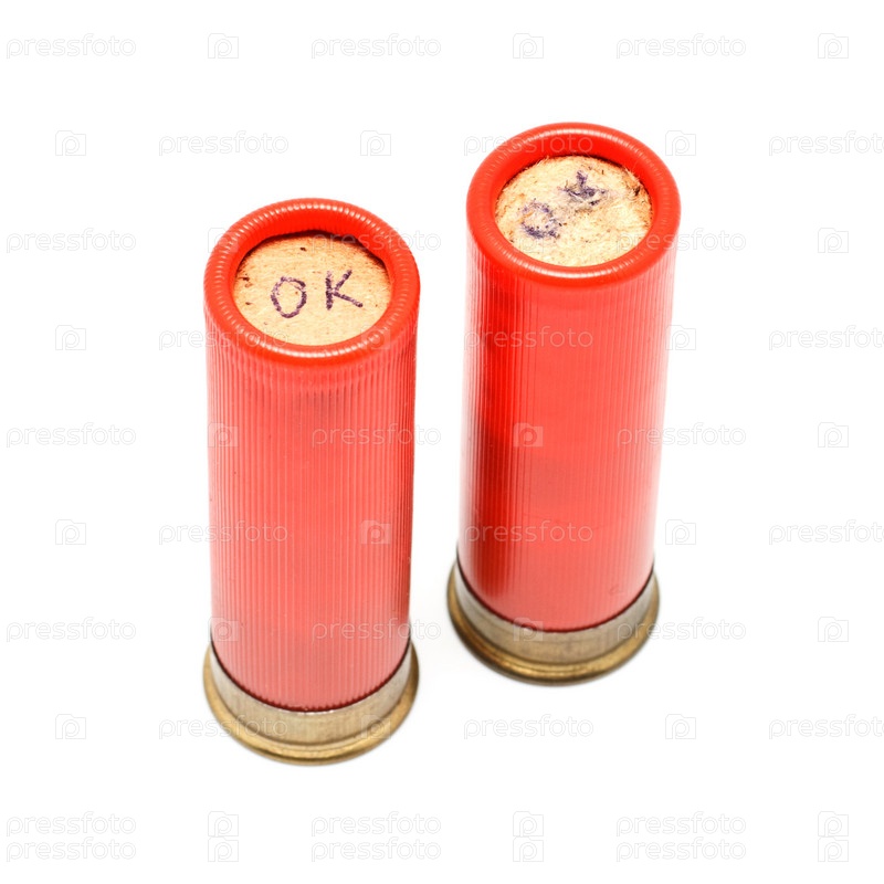 Два красных патрона для дробовика, изолированных на белом фоне
