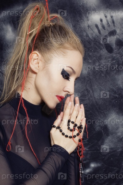 Молящаяся девушка с макияжем в готическом стиле