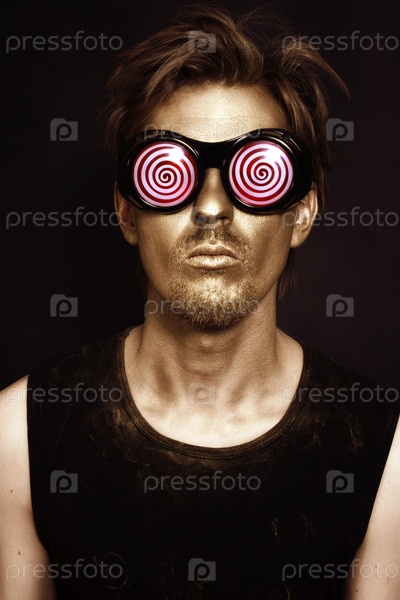 Портрет молодого актера с бронзовым театральным гримом в странных очках на черном фоне