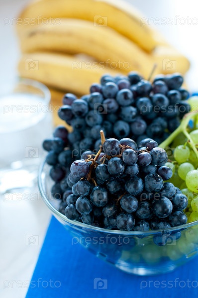 Свежий виноград, бананы и стакан воды. Малая глубина резкости