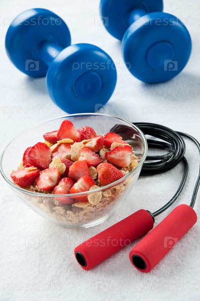 Тарелка мюсли, скакалка и гантели на белом полотенце. Концепция здорового образа жизни