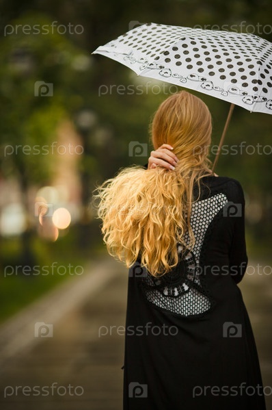 Девушка с белым зонтиком под дождем