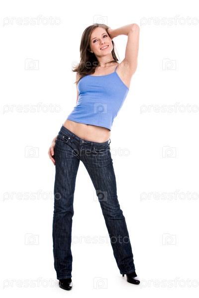 Портрет симпатичной девушки, одетой в синий танктоп и джинсы на белом фоне