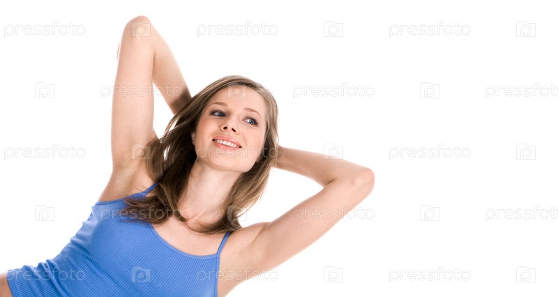 Портрет симпатичной девушки, одетой в синий танктоп и прикасающейся к волосам на белом фоне