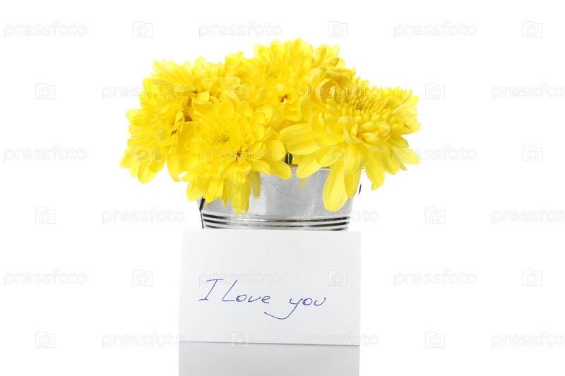 Букет желтых хризантемов в ведрах на белом фоне с карточкой 'Я люблю тебя'