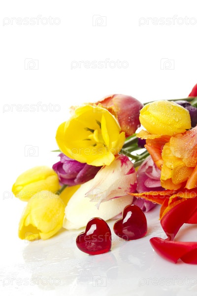 Тюльпаны с каплями воды и два красных сердца на белом фоне