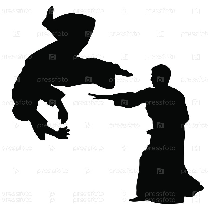 Силуэты двух людей, занимающихся единоборствами, на белом фоне