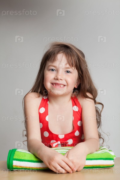 Маленькая девочка с полотенцем улыбается беззубым ртом