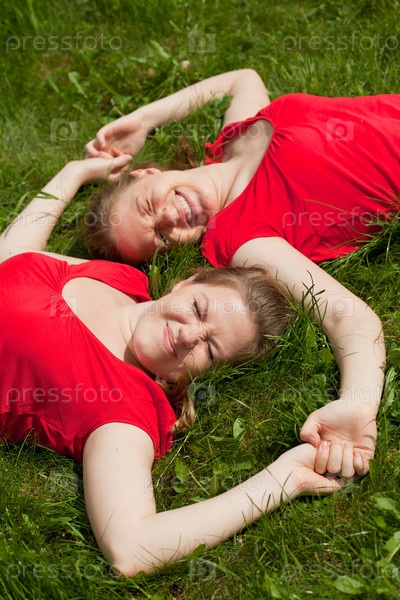 Девушки-близнецы в одинаковых блузках отдыхают на траве