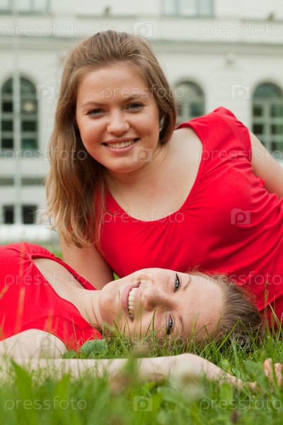 Девушки-близнецы в одинаковых блузках отдыхают на траве