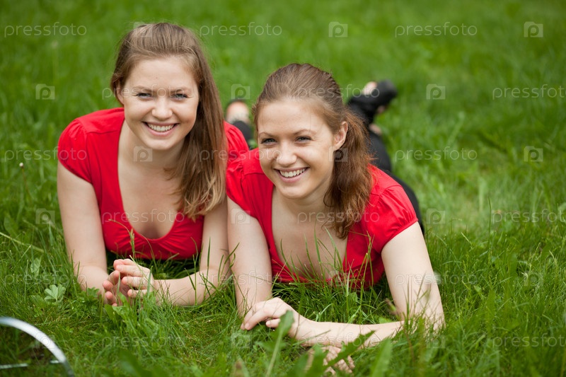 Девушки-близнецы в одинаковых блузках отдыхают на траве