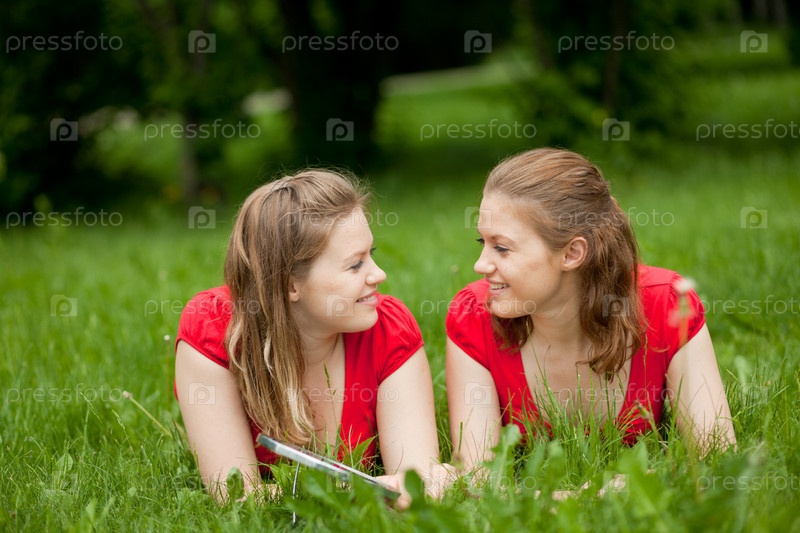 Девушки-близнецы в одинаковых блузках отдыхают на траве