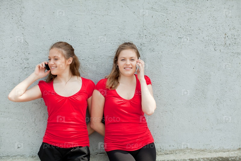 Девушки-близнецы разговаривают по мобильному телефону