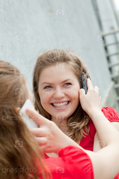 Смеющиеся девушки-близнецы разговаривают по мобильному телефону друг-друга